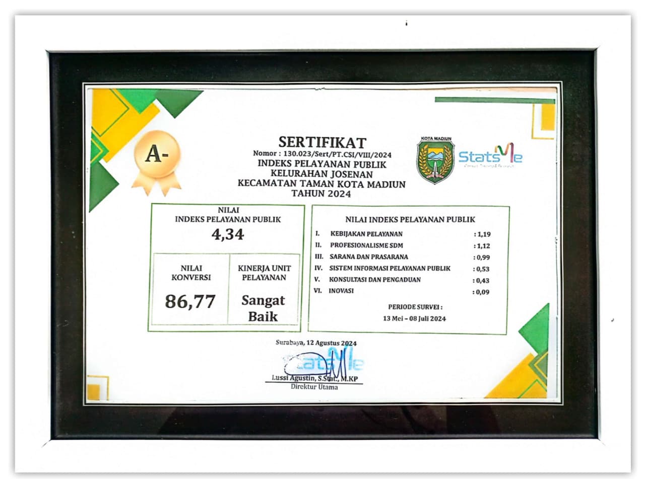 Indeks Pelayanan Publik dan Indeks Kepuasan Masyarakat Kelurahan Josenan Tahun 2025